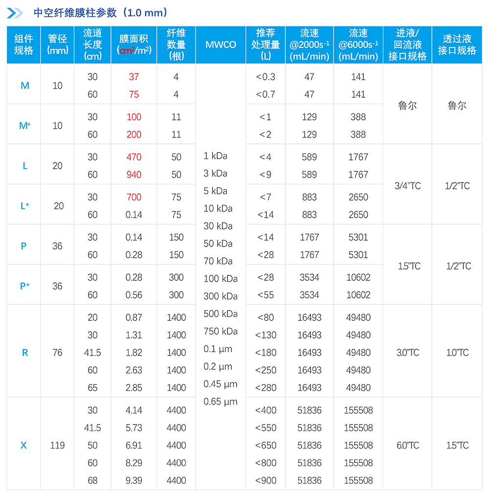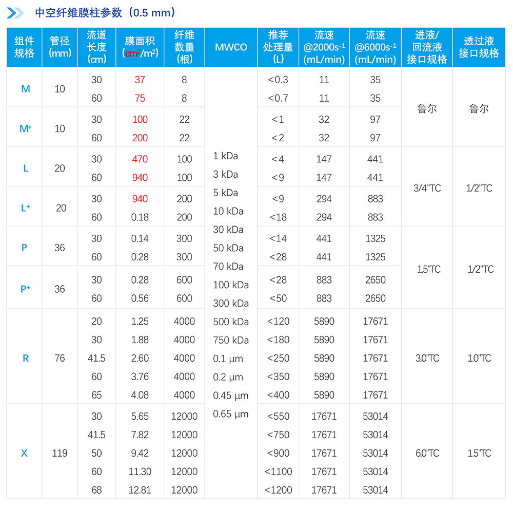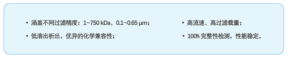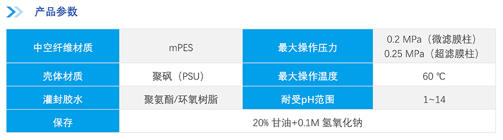 中空纤维膜丝采用改性聚醚砜(mPES)制备,抗污染性能强;非对称梯度孔结构及均一孔径保证高过滤精度的同时能获取更高通量,提高产品收率。中空纤维膜柱采用符合医疗级别的外壳材料,生物相容性优异,在灭菌环境中稳定性优良;选用的胶黏剂粘接强度高,耐热性、耐化学性及生物相容性优良;同时采用优化的注胶工艺,注胶精度高,产品无缺陷。